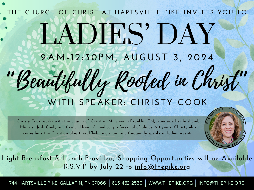 744 Hartsville Pike Gallatin, TN 37066 Directions Hartsville Pike Church of Christ August 3, 2024 9:00 am – 12:30 pm Featured, Ladies Ladies Day: Beautifully Rooted in Christ Share this: Share on X (Opens in new window) X Share on Facebook (Opens in new window) Facebook Share on Pinterest (Opens in new window) Pinterest Email a link to a friend (Opens in new window) Email Like this:Like Loading... Related